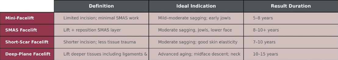 - SMAS Facelift: deeper structural aging, 50s–70s