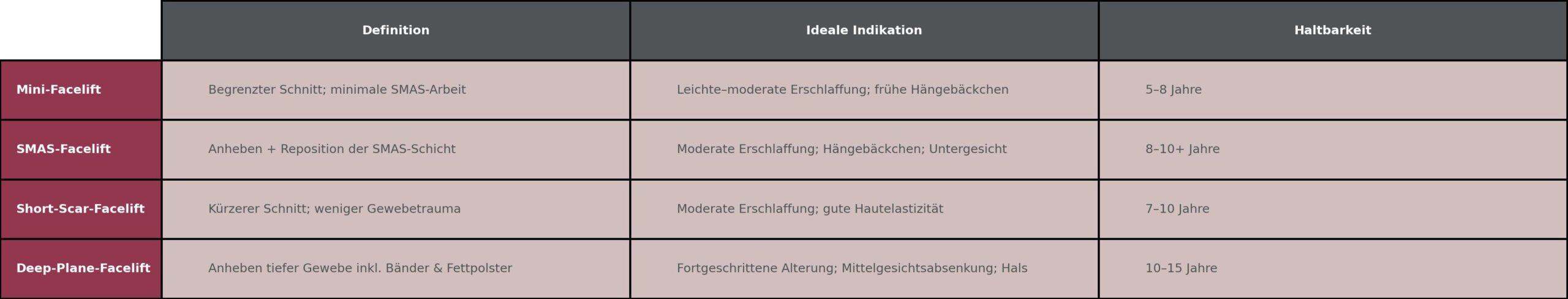 Es gibt viele beschriebene Techniken fuer ein Facelift: Mini-Lift, SMAS-Plication, SMAS-Flap, Short-Scar, Deep-Plane und weitere Varianten. Sie unterscheiden sich in der Laenge der Schnitte, der Tiefe und dem Vektor des Liftings sowie dem Umfang der korrigierten stuetzenden Strukturen. Aktuelle Studien zeigen jedoch: Wenn zwei unterschiedliche Techniken bei aehnlichen Patientinnen und Patienten von einem hochqualifizierten Chirurgen angewendet werden, koennen die Ergebnisse sehr aehnlich sein. Dies unterstreicht, dass Erfahrung, aestehtisches Verstaendnis und praezises Arbeiten des Chirurgen wichtiger sind als der Name der Technik.